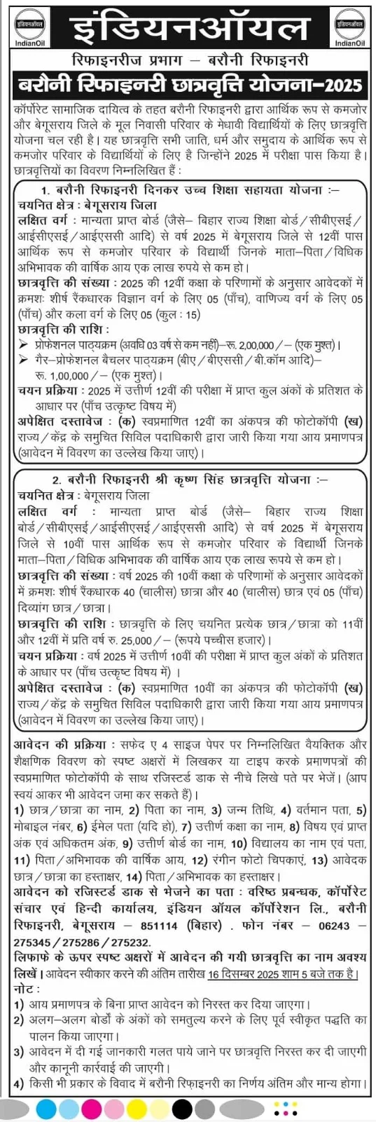 Barauni Refinery Scholarship 2025: अगर आप 10वीं पास हैं, बेगूसराय जिले से आते हैं और आगे की पढ़ाई के लिए आर्थिक सहायता की तलाश में हैं, तो आपके लिए एक बड़ी खुशखबरी है। इंडियन ऑयल द्वारा बरौनी रिफाइनरी श्री कृष्ण सिंह छात्रवृत्ति योजना की शुरुआत की गई है। इस स्कॉलरशिप के तहत कक्षा 11वीं और 12वीं में पढ़ने वाले छात्रों को हर साल ₹25,000 की छात्रवृत्ति प्रदान की जाएगी। इस योजना के लिए इच्छुक विद्यार्थी 16 दिसंबर 2025 तक ऑनलाइन आवेदन कर सकते हैं।
